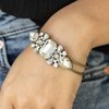 Featuring regal teardrop, oval, emerald, and round cuts, an explosion of oversized rhinestones neatly coalesce into a sparkly centerpiece atop an antiqued brass cuff for a dramatically dazzling display. Features a hinged closure.