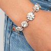Gradually increasing in size at the center, a dramatic row of exaggerated white rhinestone encrusted silver frames delicately link around the wrist for a statement-making sparkle. Features an adjustable clasp closure.