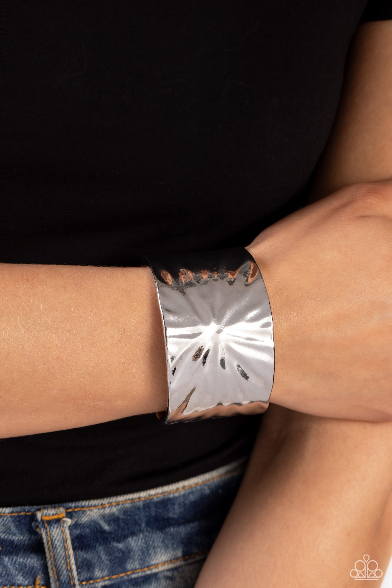 A thick band of silver, featuring warped textures across its surface wraps around the wrist for a standout centerpiece, reflecting light off every fold.