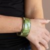 Featuring a faux marble finish, a green acrylic centerpiece attaches to an Olive Branch leather frame that is studded in place along a distressed Olive Branch leather band for a colorfully rustic fashion. Features an adjustable snap closure.