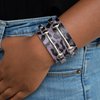 Two arcing silver bars are studded in place across the front of a thick leather band painted in blue and black cheetah print for a wild look. Features an adjustable snap closure.