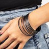 A collection of classic shiny copper bangles, varying in smooth and textured finishes creates a sassy look as they layer around the wrist.