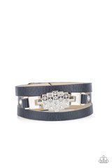 A white rhinestone silver centerpiece is studded in place by white rhinestone encrusted silver studs across the spliced center of a white leather band, creating a glittery urban look around the wrist. Features an adjustable snap closure.