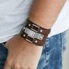 A collection of leather pieces and shiny silver frames are studded in place across the front of a thick leather band, creating an abstract buckle. Features an adjustable snap closure.